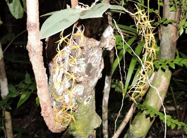 Comprised of a very rare vegetation type – low-elevation humid forest on basalt – Ankarabolava-Agnakatrika is home to some equally rare plants, including Hibiscus vohipahensis. Discovered right here in our project area and yet to be found anywhere else on Earth, its survival rests entirely on the future of this forest. There is also the Sylvichadsia grandidieri tree, known from Ankarabolava-Agnakatrika and just one other protected area; the Critically Endangered palms Dypsis elegans Beentje and Dypsis singularis Beentje; and the threatened orchid Aerangis seegeri Senghas.