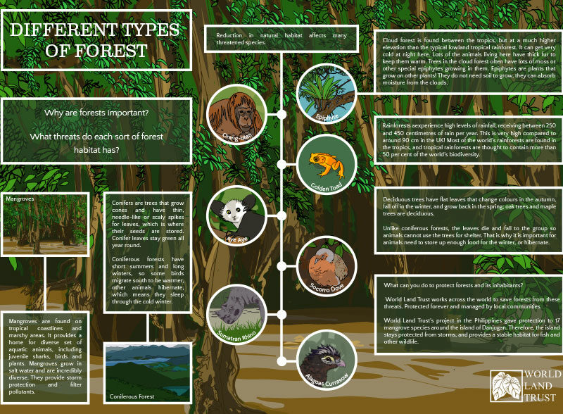 Learn how types of forest vary, where they can be found, and the types of animals that live there.