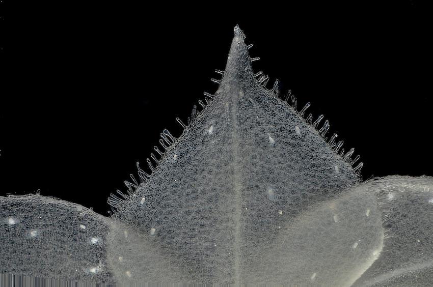 “I’ve finally gotten to the point where I am almost satisfied with my photographs of the micro-textures of the new orchids. This photo (above) has more dramatic lighting than is normal for scientific microphotos, but I like the effect. They look like mysterious translucent deep-sea creatures floating through the blackness of the deep ocean (they are in fact floating in alcohol against a backdrop of a special black light-absorbing velvet-like material. A computer controls both the camera and a motor that turns a microscope focusing dial. Hundreds of pictures are taken in succession, with the computer moving the microscope focus a few microns between each picture.” – Lou Jost.