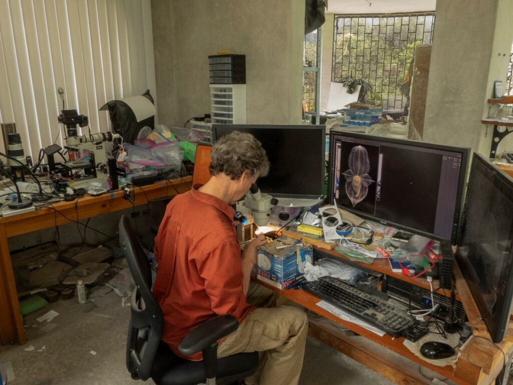 Lou Jost working from his home in Banos, Ecuador, creating detailed microphotos of orchid specimens.