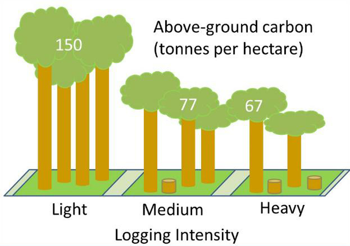We found forests where little logging had occurred stored twice as much carbon as forests that had been heavily logged. This highlights the damage that is caused by unsustainable logging. If the amount of logging can be reduced, forests should recover, storing more carbon and helping to reduce climate change.
