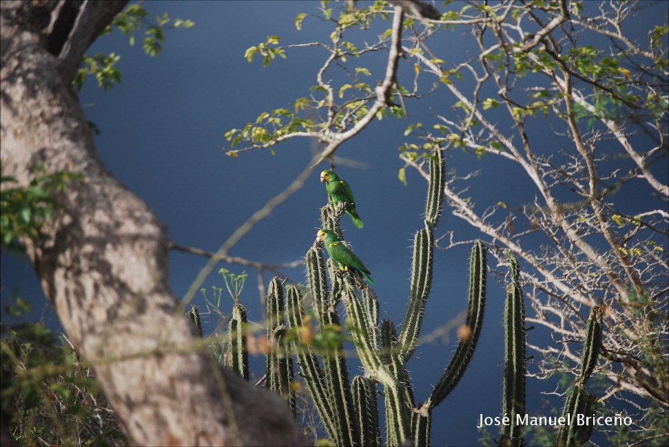 Yellow-shouldered Parrots in their desert shrubland on Margarita Island. Image Credit: Jose Manuel Briceno.