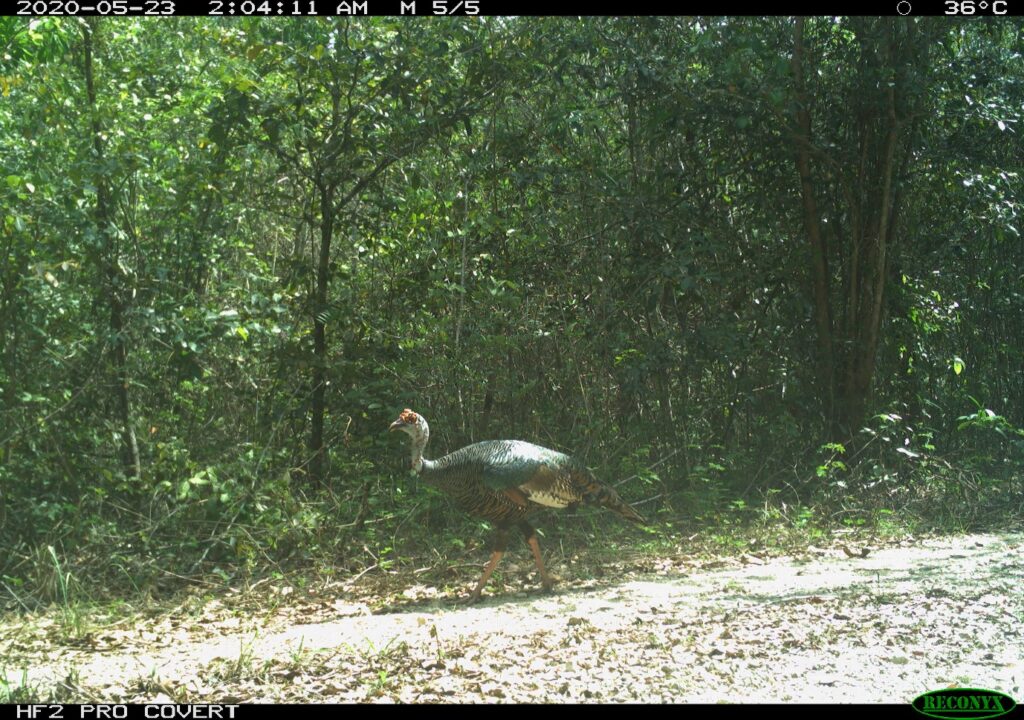 Camera trap image of an Ocellated Turkey in Belize. Image credit: Programme for Belize.