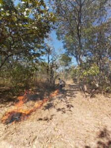 The following four pictures depict rangers conducting early burning before the woodlands have completely dried, leaving a mosaic of burned and unburned habitat that limits the spread and intensity of more damaging fires later in the dry season.