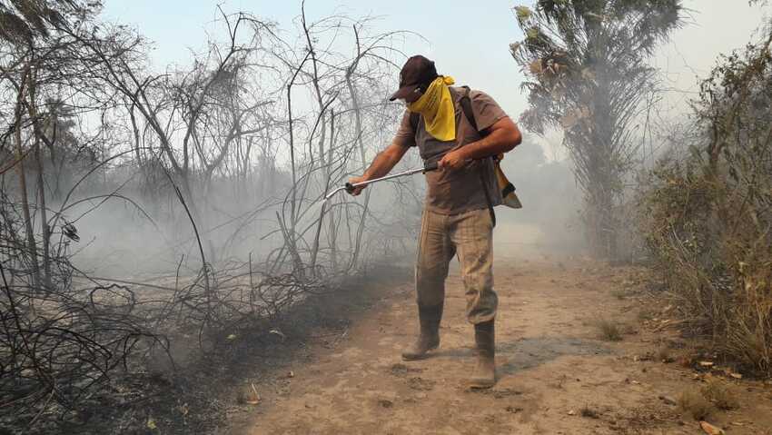 A Keepers of the Wild ranger dampens down smouldering ashes from a fire at the Chaco-Pantanal Reserve, Paraguay in 2019. Image credit: Tatiana Galluppi/ Guyra Paraguay.