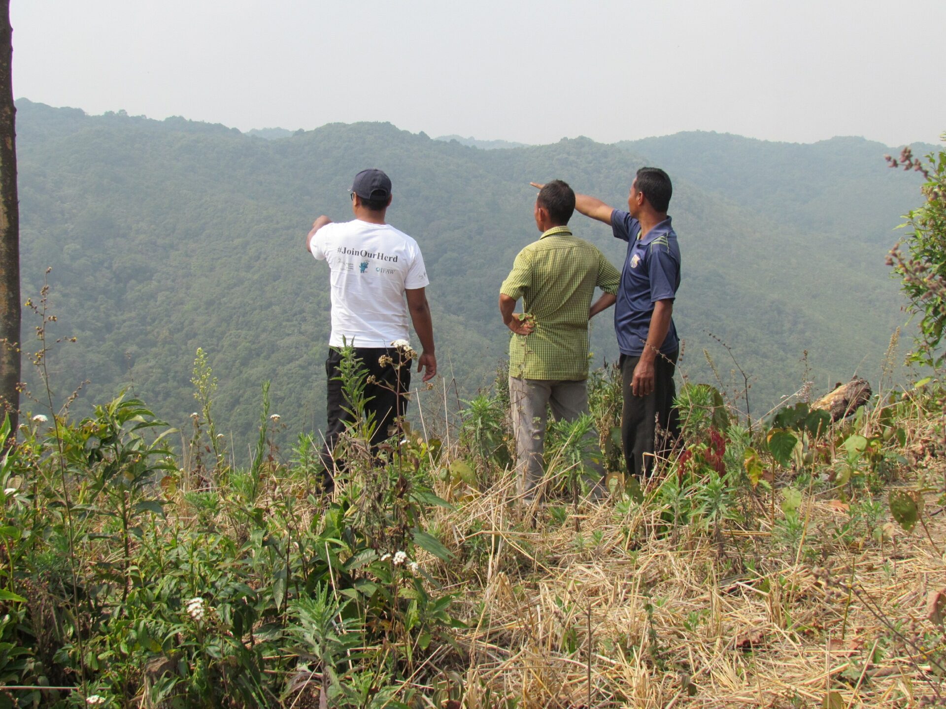 WTI’s Balsreng Sangma meets with a nokma (village headman) and his secretary to discuss the extension of their Village Reserve Forest. Image: WTI