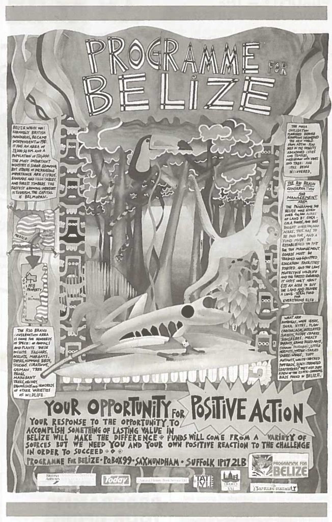 The rest, as documented by Programme for Belize’s first ever print newsletters, is history. By autumn 1989, over 1,000 people had already donated £80,000 (more than double in today’s money) of the campaign’s £150,000 target. Helping reach the goalpost were colourful posters by Bob Linney, newspaper features by Sir David Attenborough – today a WLT Patron – and reports from the field by John Burton. “Belize really is a naturalist’s paradise … We saw crocodiles in the rivers and pools, spectacled owls, ocellated turkeys, grey foxes,” John would write after a visit in July 1989.
