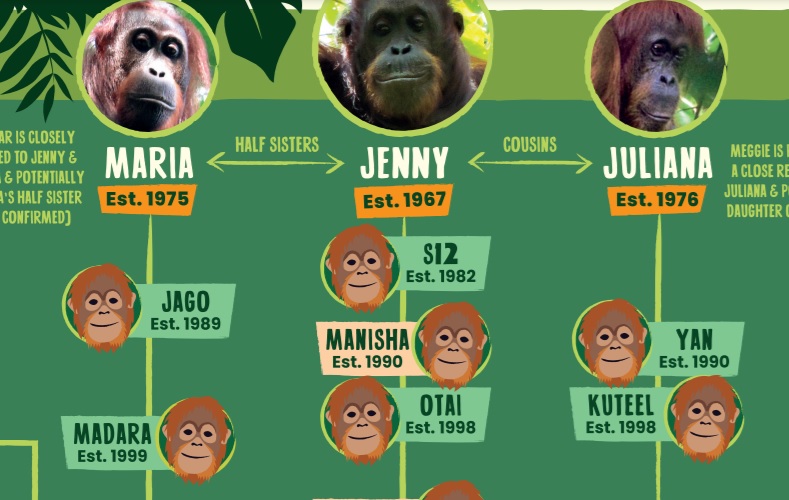 Thanks to the HUTAN researchers who have spent decades observing these great apes, today we can bring you the family tree of a very special community – the orangutans that HUTAN knows as the “Front Side River” family group.