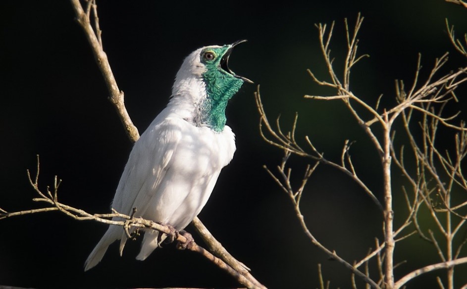 Endemic to the Atlantic Forest, the Bare-throated Bellbird (Procnias nudicollis) is one of many bird species restricted to primary forest and well-established secondary forest that are gradually expanding into reforested areas at REGUA. Last year the IUCN reduced their Red List category from Vulnerable to Near Threatened. However, the population is still declining throughout their range due to deforestation and trapping for the cage-bird trade. Image credit: Gabriel Mello