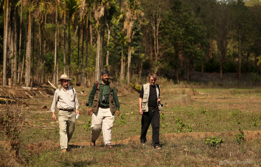 Simon Barnes with Vivek Menon (Executive Director of WTI) and John Burton, inspecting land for potential elephant corridors.
