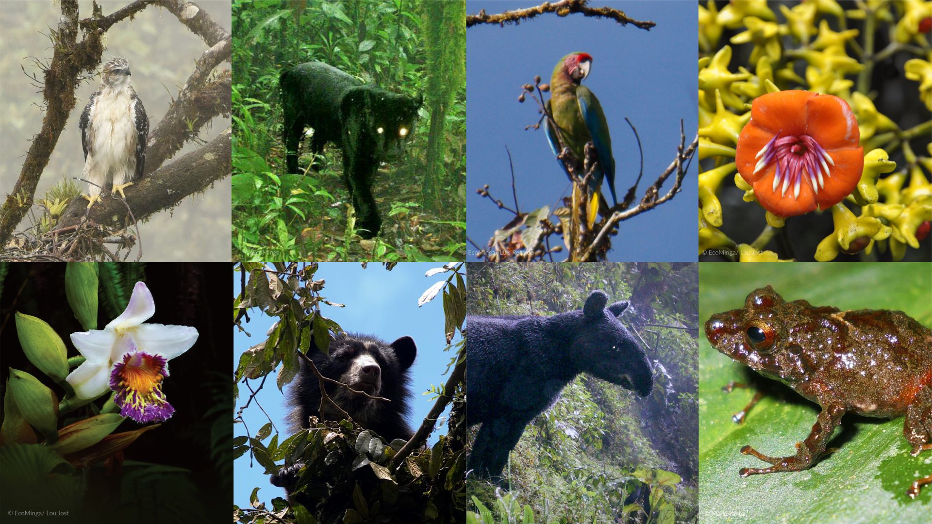Clockwise from top left: Black-and-chestnut Eagle, melanistic Jaguar, Military Macaw, Meriania aurata and Pristimantis sacharuna (both discovered in Zúñac), Mountain Tapir, Spectacled Bear, Sobralia luerorum orchid