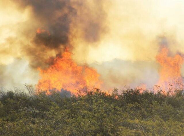 A wildfire burns at Fundacion Patagonia Natural reserve Estancia la Es...