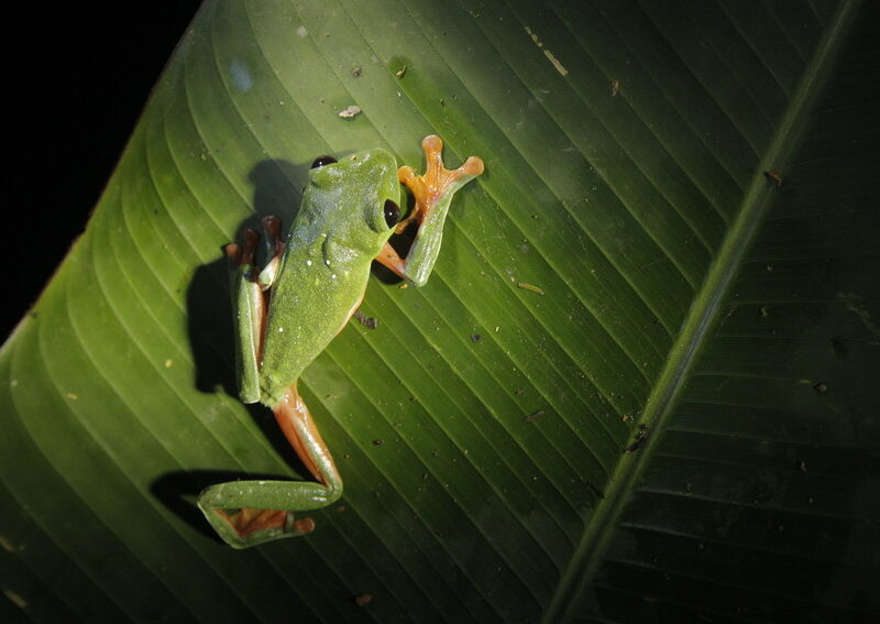 The Black-eyed Leaf Frog is a nocturnal and arboreal species. On the onset of the rainy season males descend from the canopy and congregate in loud choruses of advertising “sworp” calls to attract females and aggressive “chuckling” calls to ward off other males.¹ Gelatinous clumps of eggs are deposited on a wide range of surfaces but mostly on the undersides of leaves hanging over water. The eggs take five to ten days to develop before the tadpoles fall into the water below and spend 55-58 days in this life stage before metamorphosis.