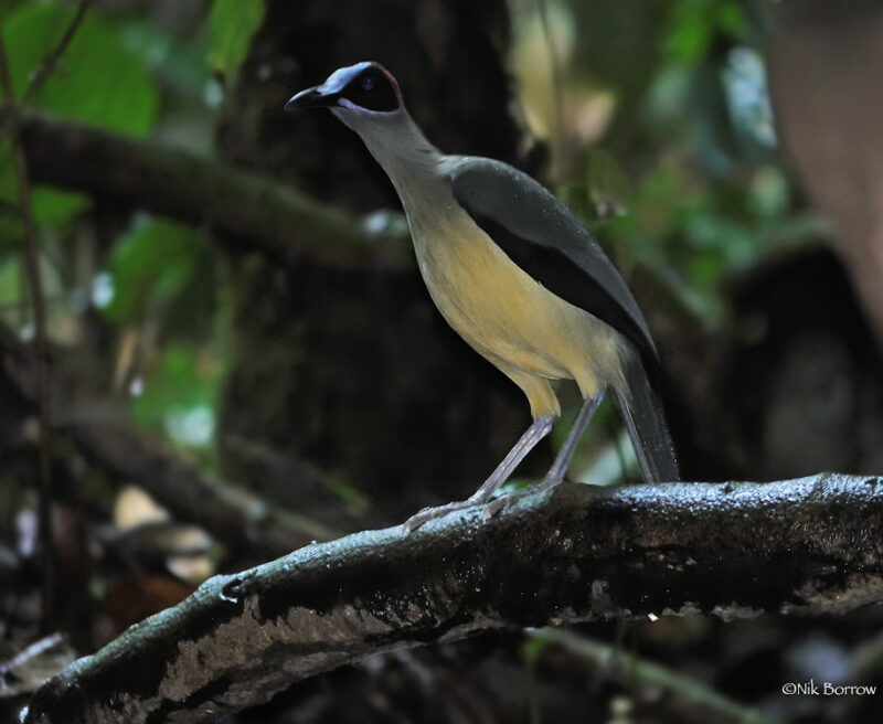 Grey-necked Rockfowl forage in dense forest and breed in rocky areas below closed-canopies in undisturbed rainforest.