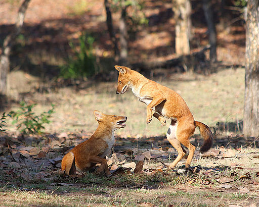 The Dhole, otherwise known as the Asiatic Wild Dog, Whistling Dog or Red Wolf, has been described as a canid which combines the characteristics of the Grey Wolf and the Red Fox. The Dhole has rust-coloured fur with a paler throat and underbelly, amber eyes and a dark tail. Compared to the African Wild Dog, it has a long backbone and short legs, but it shares rounded, rather than pointed, ears with its African relative.