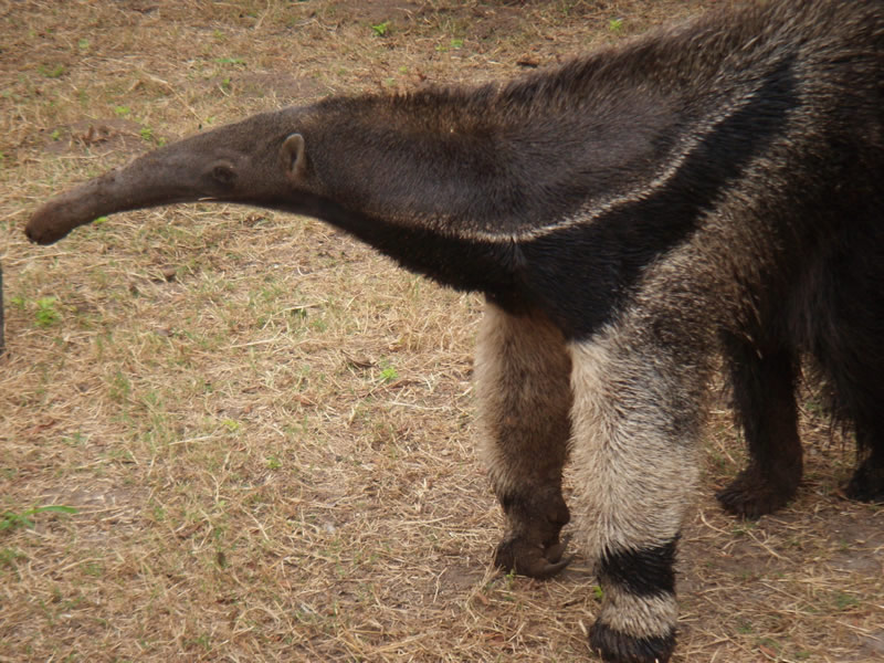 The Giant Anteater, as its name suggests, is the largest of the 4 species of anteaters and can weigh up to 23 kg (50 lb) and can measure up to 240 cm in overall length. All anteaters are insectivorous and Giant Anteaters have a long tube-shaped nose, with a tiny mouth and a long, sticky tongue. They use their strong front claws to open termite hills and also for defence; when walking their claws are tucked under and they walk on their knuckles.