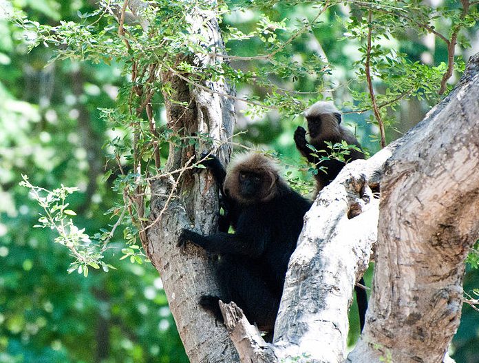 The Nilgiri Langur, also known as Indian Hooded Leaf Monkey, John’s Langur and Black Leaf Monkey, is an attractive black Colobine monkey with a pale gold mane. The rump and base of the tail are white, and females have white highlights on their inner thighs which are present from an early age.
