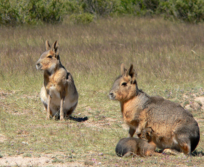 The Patagonian Mara forages on grasses or shrubs and may spend long periods basking in the sun during the day. By night, it finds shelter in a burrow or amongst dense vegetation.